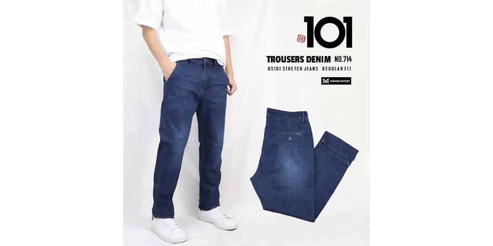 - ขอแนะนำ TROUSERS DENIM NO.714 (US101 Stretch Jeans) จาก 101FashionFactory! กางเกงยีนส์ที่ผสมผสานความคลาสสิกของเดนิมเข้ากับความสบาย เพื่อให้คุณดูดีได้ในทุกโอกาส